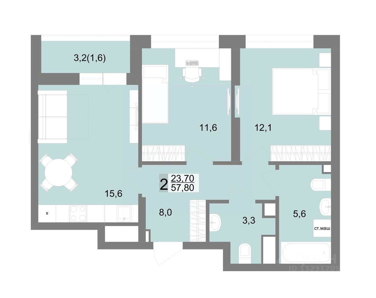 Общая площадь57,8 м2