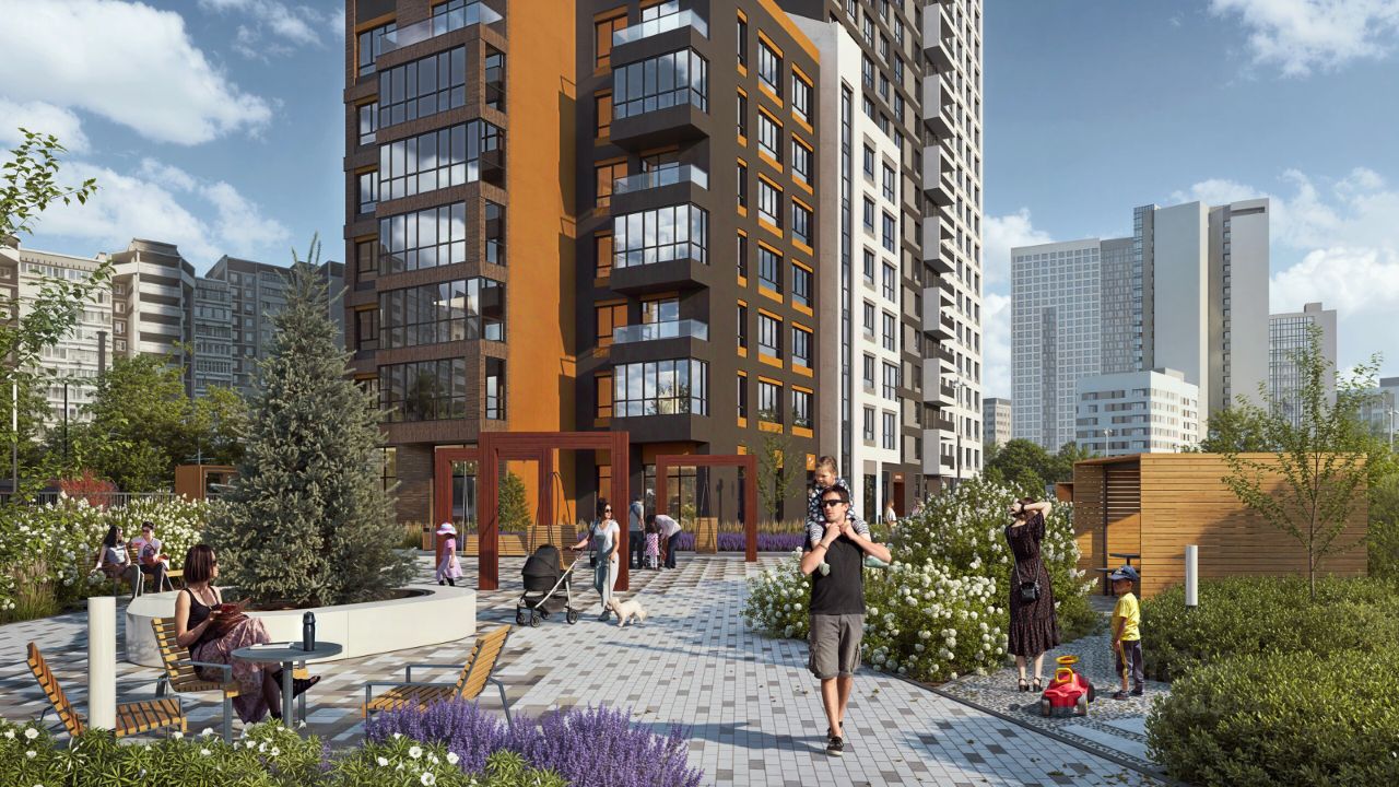 Комплекс располагается условно в центре нового фронта застройки улицы Викулова. Посадка домов сформирована параллельно улице, таким образом создавая закрытое приватное пространство от оживленной магистральной улицы. Архитектура и фасадные материалы откликаются на контекст, вносят в него новое, не доминируя. 7-ми этажная секция сдвигается вглубь участка, отделяясь от 25 - этажной секции. Это сомасштабный человеку объем с отделкой под клинкерный кирпич, с сочетанием разной кладки, что придает комплексу строгий и элегантный вид. Верхний этаж подрезается в местах лоджий, формируя силуэт. 25 - этажная секция - это наслоение двух объемов. Каждый фасад имеет свой ''взгляд'' на город. В торцах башни появляются лоджии-призмы, объединенные в 2-3-7 этажей смещены относительно друг друга.
