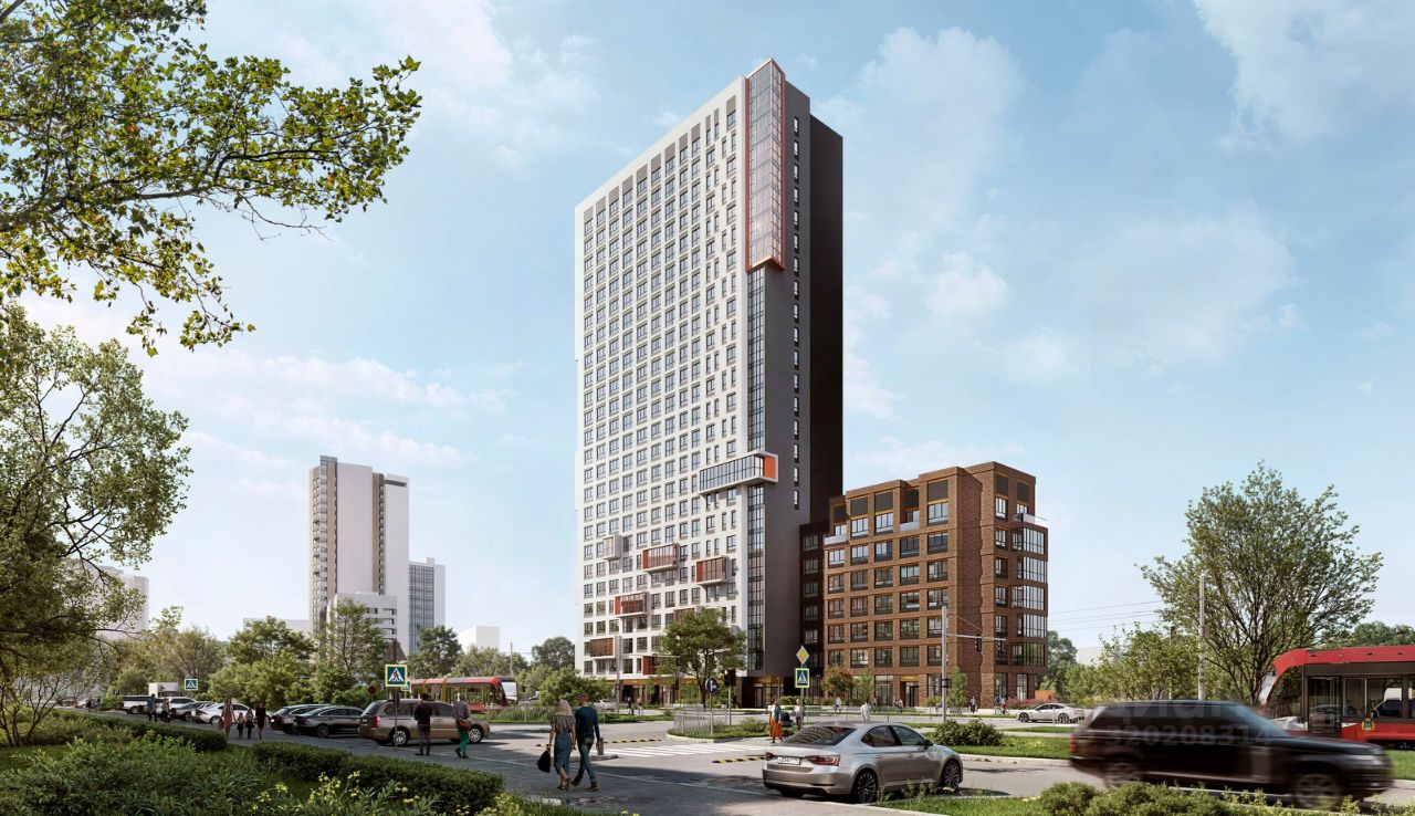 Комплекс располагается условно в центре нового фронта застройки улицы Викулова. Посадка домов сформирована параллельно улице, таким образом создавая закрытое приватное пространство от оживленной магистральной улицы. Архитектура и фасадные материалы откликаются на контекст, вносят в него новое, не доминируя. 7-ми этажная секция сдвигается вглубь участка, отделяясь от 25 - этажной секции. Это сомасштабный человеку объем с отделкой под клинкерный кирпич, с сочетанием разной кладки, что придает комплексу строгий и элегантный вид. Верхний этаж подрезается в местах лоджий, формируя силуэт. 25 - этажная секция - это наслоение двух объемов. Каждый фасад имеет свой ''взгляд'' на город. В торцах башни появляются лоджии-призмы, объединенные в 2-3-7 этажей смещены относительно друг друга. Этот прием помогает акцентировать торцы с дальних ракурсов, при этом основная фасадная сетка остается спокойной, постепенно растягиваясь к верхним этажам. Со 2 по 8 этажи на белой плоскости фасада появляются эркеры, создавая аккуратный рельеф.