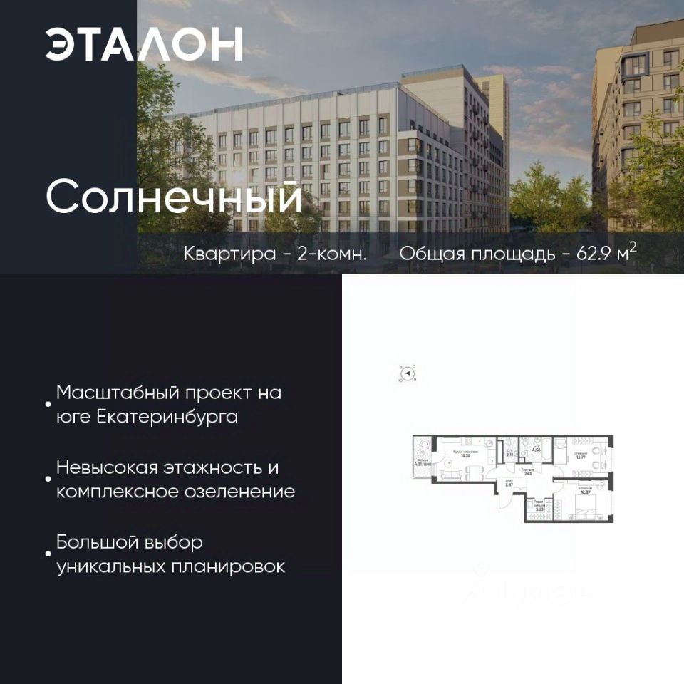 Продается квартира 460, по адресу Свердловская обл., г. Екатеринбург, Чкаловский район, корпус Солнечный, корпус 6.2 в Солнечный на 9 этаже, с площадью 62.9 м2.
