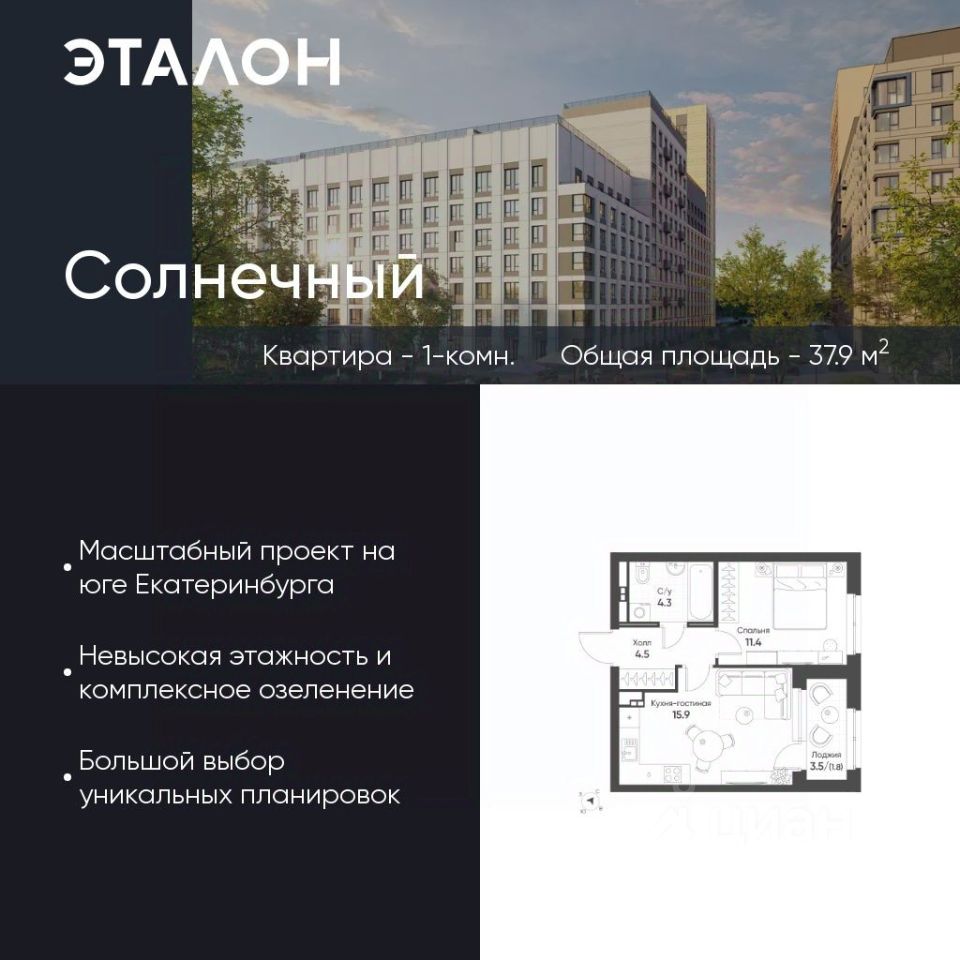 Продается квартира 308, по адресу Свердловская обл., г. Екатеринбург, Чкаловский район, корпус Солнечный, блок 6.1 в Солнечный на 4 этаже, с площадью 37.9 м2.