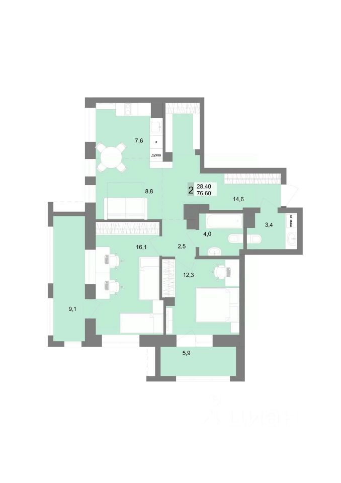 Общая площадь76,6 м2