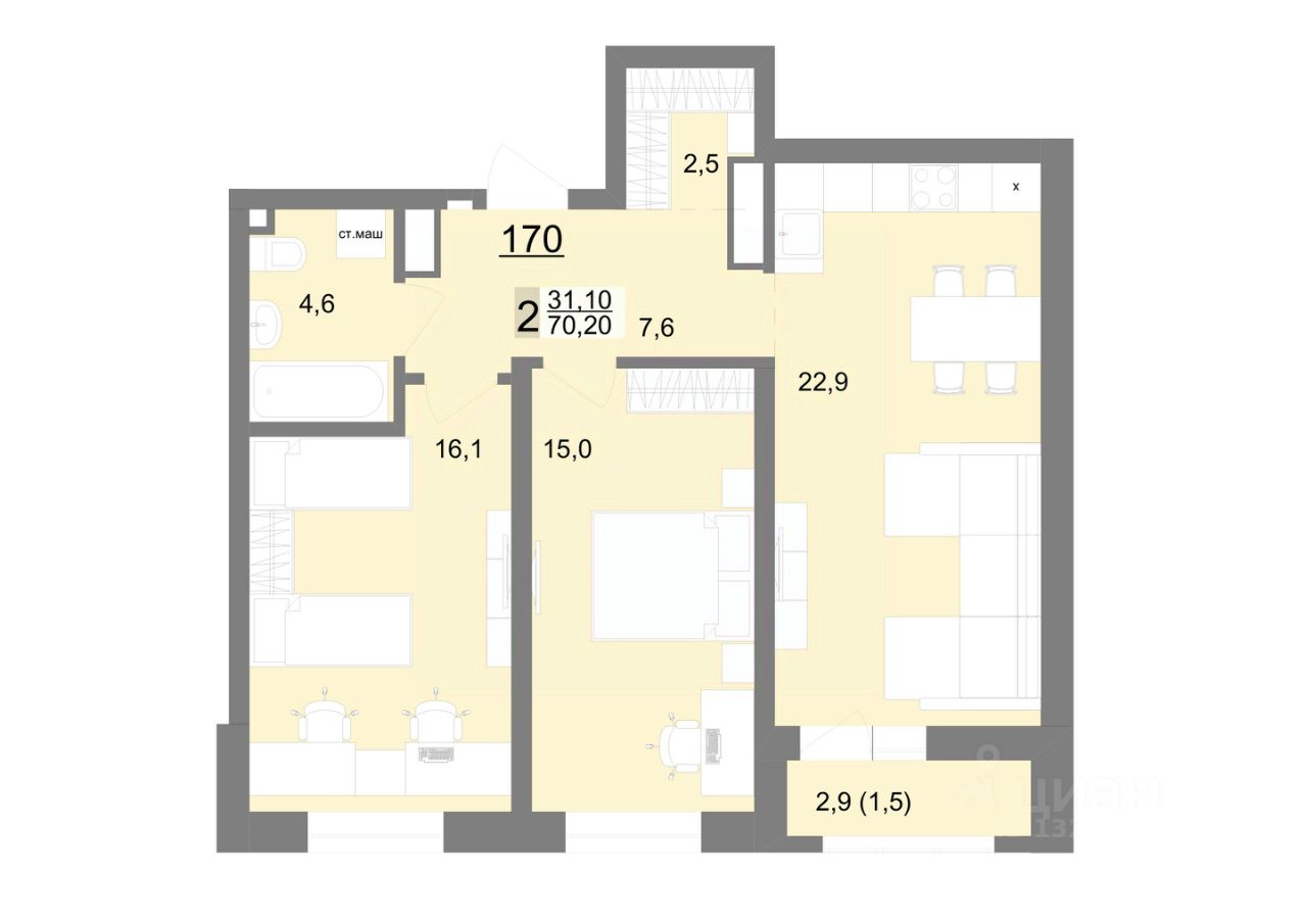 Продаётся 2-комнатная квартира в строящемся доме (Секция С1), срок сдачи: III-кв. 2026, общей площадью 70.2 кв.м., на 20 этаже. Многоэтажные жилые дома по ул. Металлургов от ГК ''Астра''. 1 очередь строительства