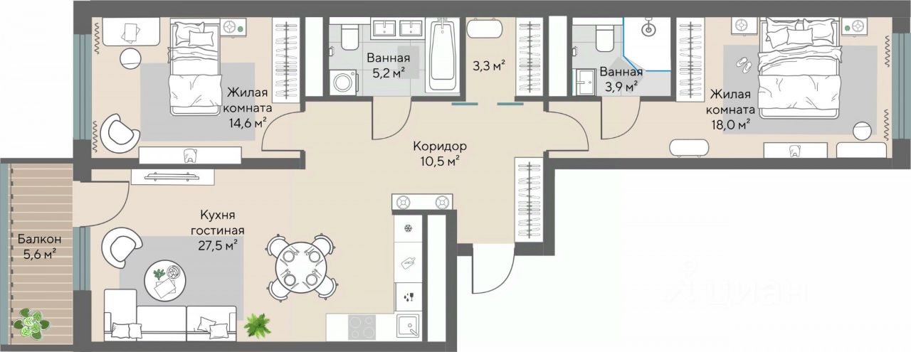 Продаётся 2-комнатная квартира в строящемся доме (Секции 1.4-1.6 (2 очередь)), срок сдачи: IV-кв. 2026, общей площадью 84.7 кв.м., на 2 этаже.