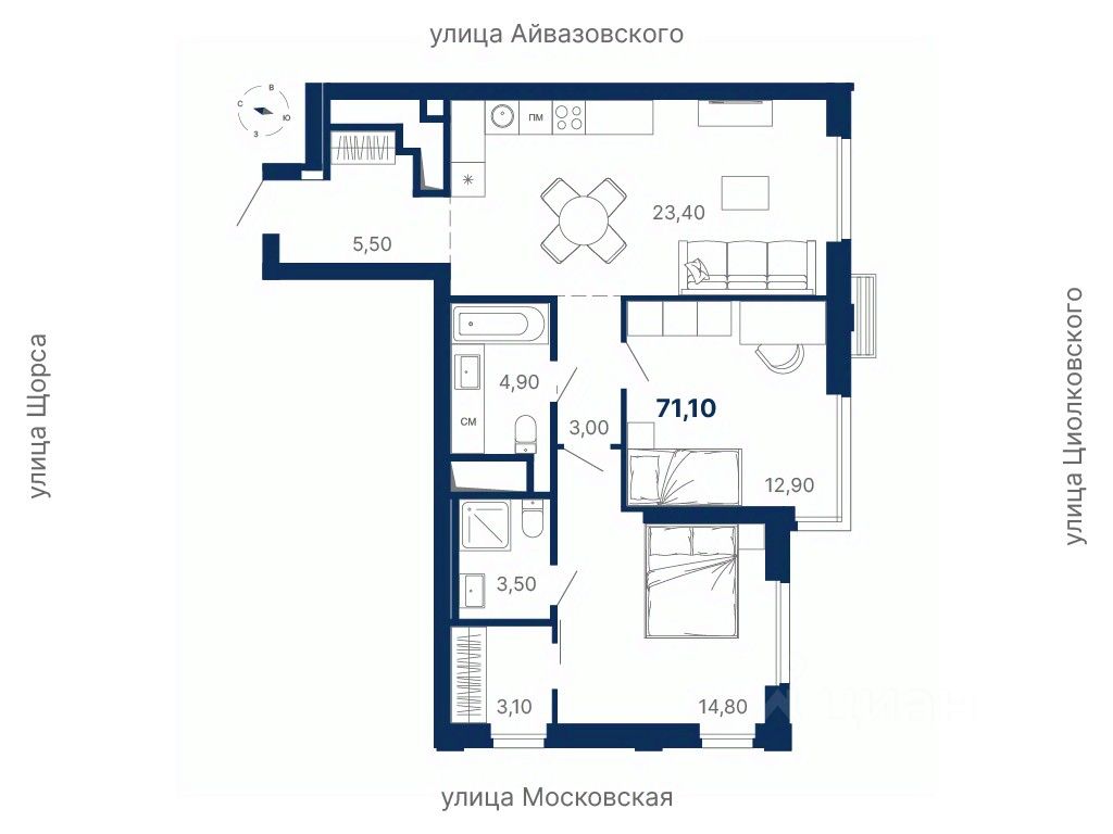 Комплекс находится в квартале улиц Московская — Щорса — Айвазовского — Циолковского.