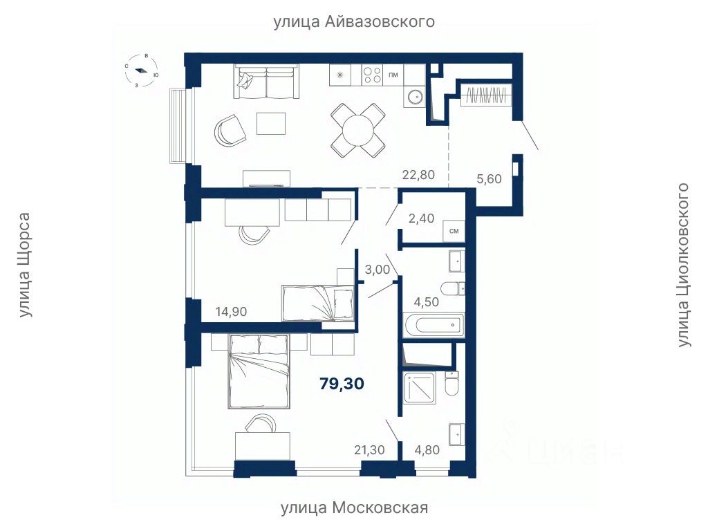 Комплекс находится в квартале улиц Московская — Щорса — Айвазовского — Циолковского.
