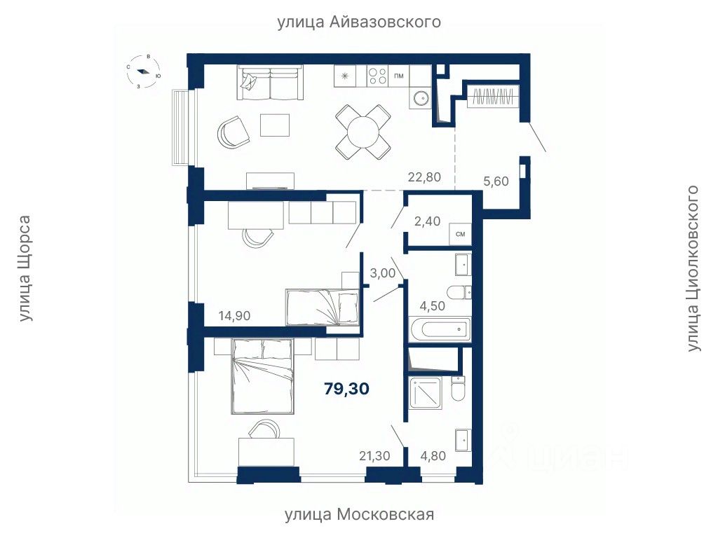 Комплекс находится в квартале улиц Московская — Щорса — Айвазовского — Циолковского.