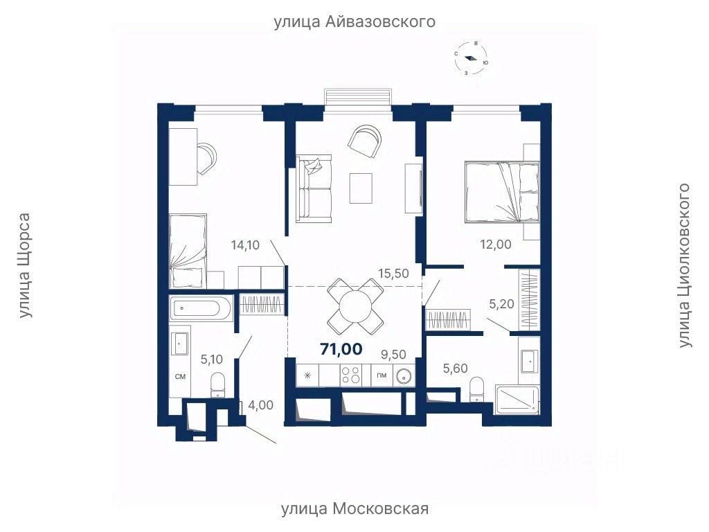 Комплекс находится в квартале улиц Московская — Щорса — Айвазовского — Циолковского.