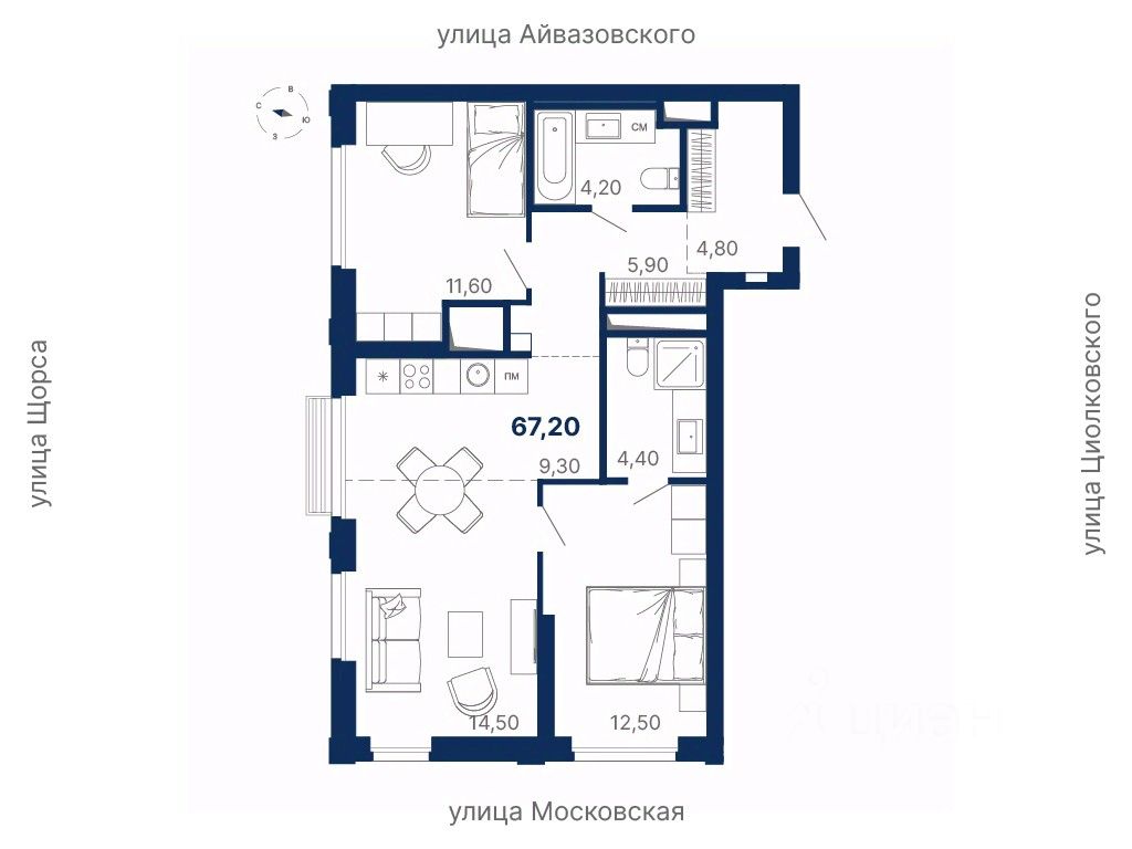 Комплекс находится в квартале улиц Московская — Щорса — Айвазовского — Циолковского.