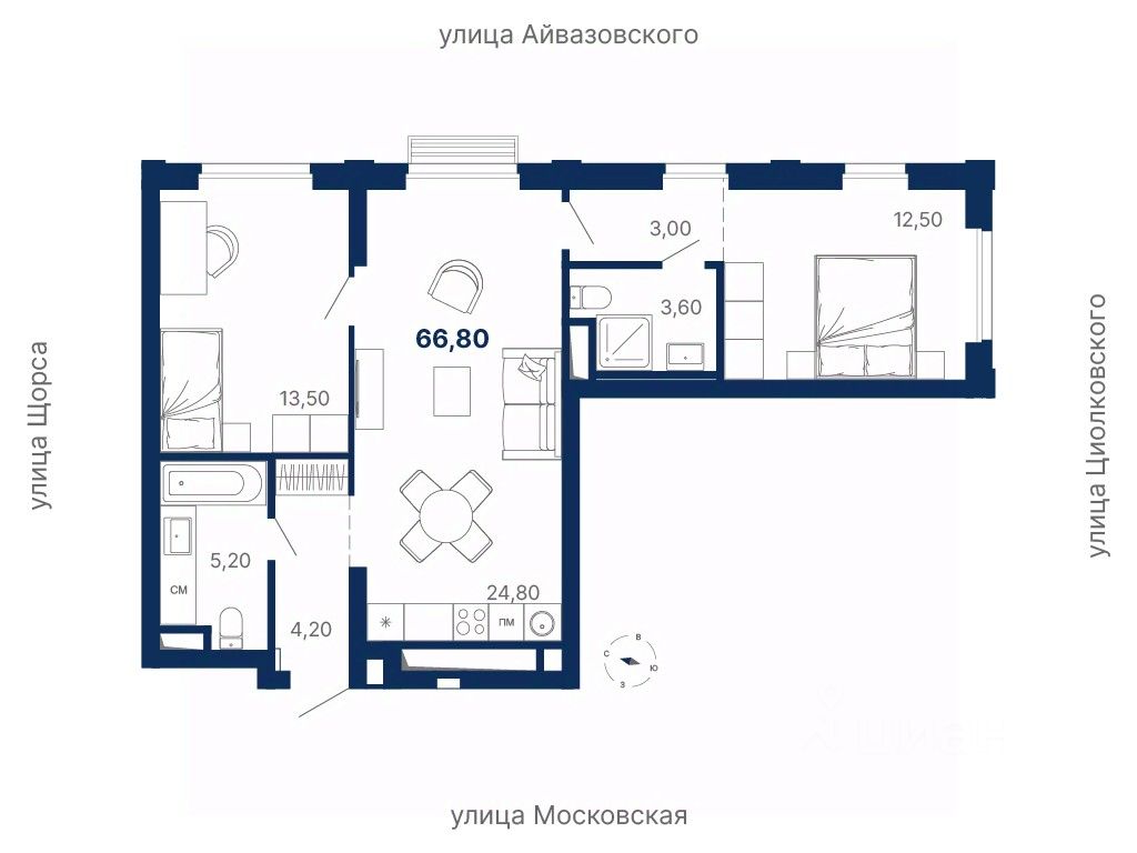 Комплекс находится в квартале улиц Московская — Щорса — Айвазовского — Циолковского.