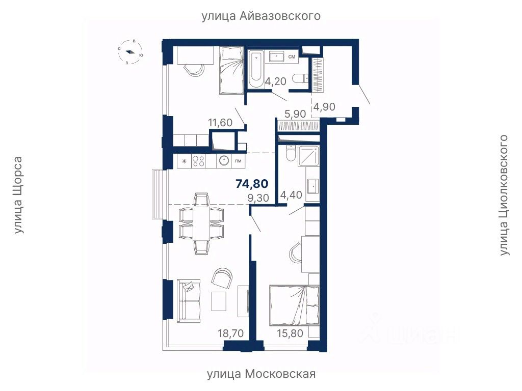 Комплекс находится в квартале улиц Московская — Щорса — Айвазовского — Циолковского.