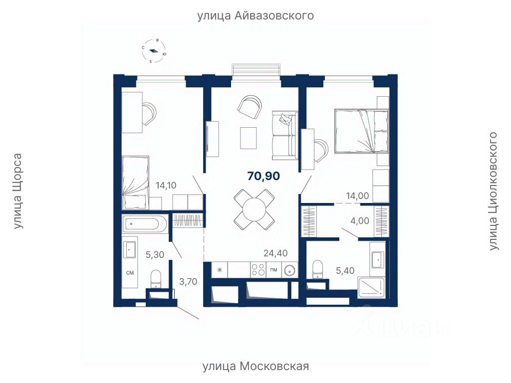 Комплекс находится в квартале улиц Московская — Щорса — Айвазовского — Циолковского.