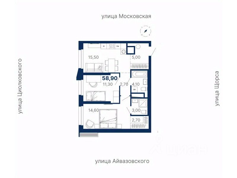 Удобное расположение между ул. Московская, Щорса, Айвазовского и Циолковского — рядом метро Чкаловская и всё необходимое для жизни.