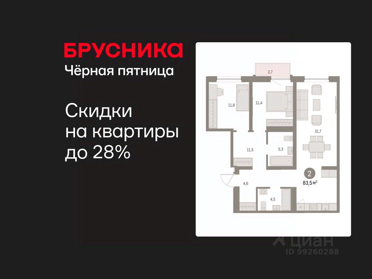 Квартира с кухней-гостиной и двумя спальнями в районе Шишимская горка. Особенности планировки: второй санузел, предчистовая отделка, балкон. квартиры в нашей базе: ШГР17.1-Ж2.3.7.