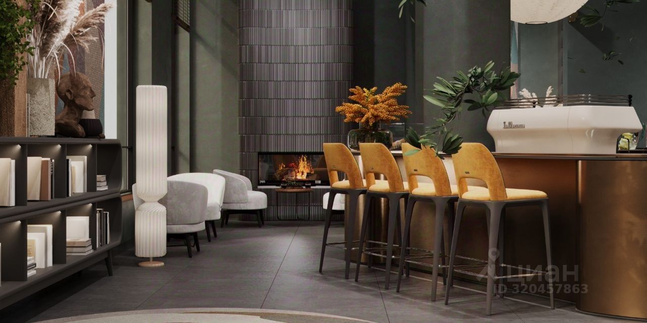 • Общественные пространства Интерьер вестибюля с кофейней, камином и панорамными видами выполнен в благородных приглушенных тонах с авторским панно из мозаики.
