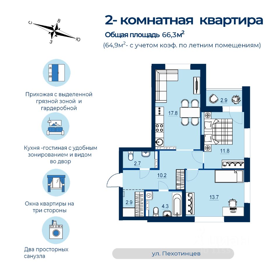 Продаётся 2-комнатная квартира в строящемся доме (Дом 1), срок сдачи: IV-кв. 2025, общей площадью 64.9 кв.м., на 11 этаже. Новый жилой комплекс ''Estelle'' от застройщика ''СЗ Инвестстрой'' расположен по адресу: г. Екатеринбург, улица Пехотинцев.