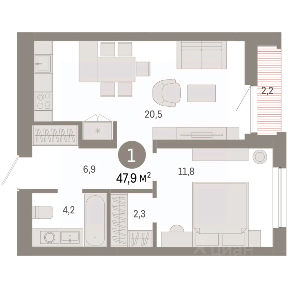 Квартира с кухней-гостиной и одной спальней в Южных кварталах. Особенности планировки: гардеробная, лоджия, предчистовая отделка. квартиры в нашей базе: ЮКВ11-Ж1.10.2.