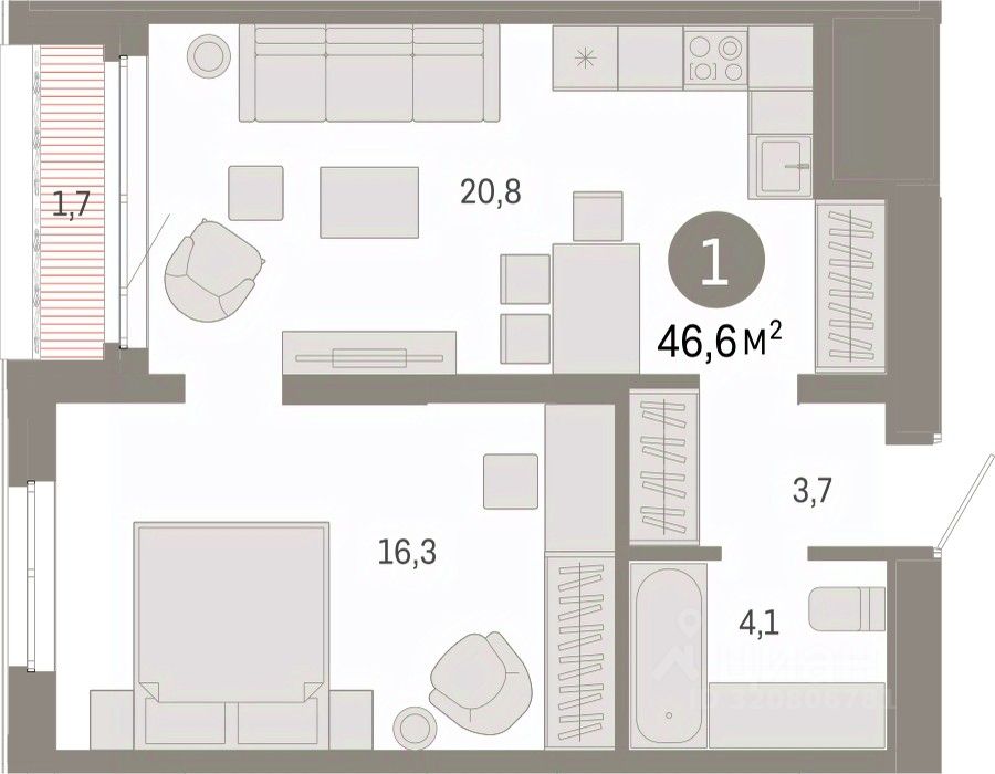 Квартира с кухней-гостиной и одной спальней в Южных кварталах. Особенности планировки: предчистовая отделка. квартиры в нашей базе: ЮК04-А1-6-6.15.3.