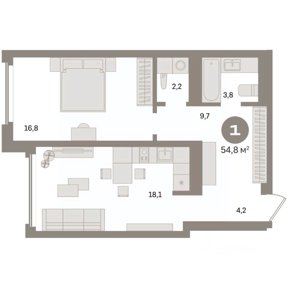 Квартира с кухней-гостиной и одной спальней в Южных кварталах. Особенности планировки: предчистовая отделка, постирочная. квартиры в нашей базе: ЮК04-А1-9-9.21.4.