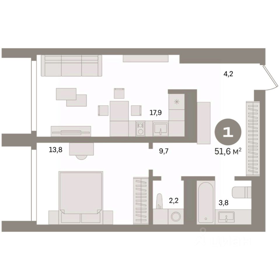 Квартира с кухней-гостиной и одной спальней в Южных кварталах. Особенности планировки: предчистовая отделка, постирочная. квартиры в нашей базе: ЮК04-А1-9-9.21.5.