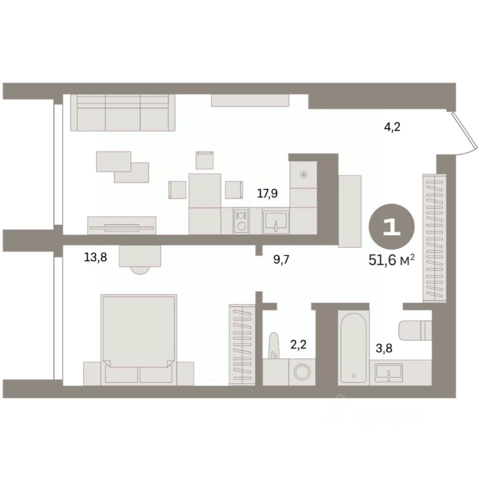 Квартира с кухней-гостиной и одной спальней в Южных кварталах. Особенности планировки: предчистовая отделка, постирочная. квартиры в нашей базе: ЮК04-А1-9-9.23.4.