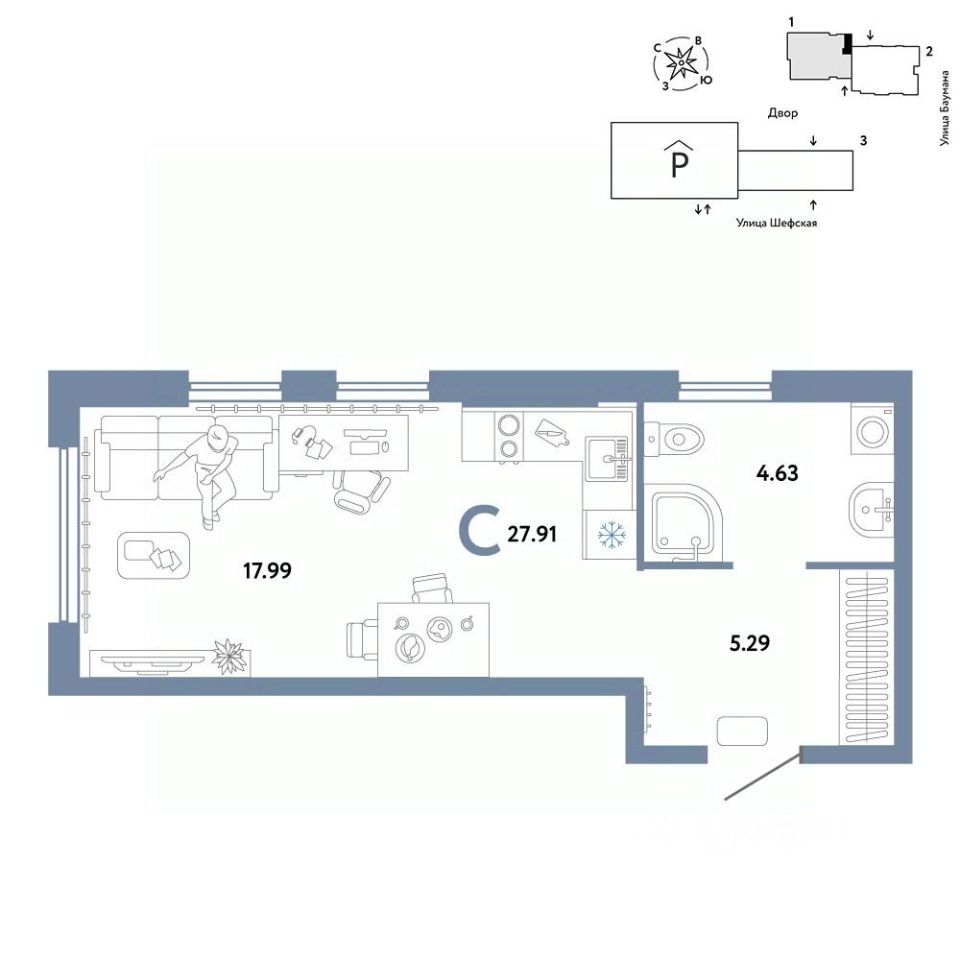Продается студия на 13 этаже от застройщика Страна Девелопмент. Площадь квартиры 27,91 кв. м. Стоимость указана без учета акций.