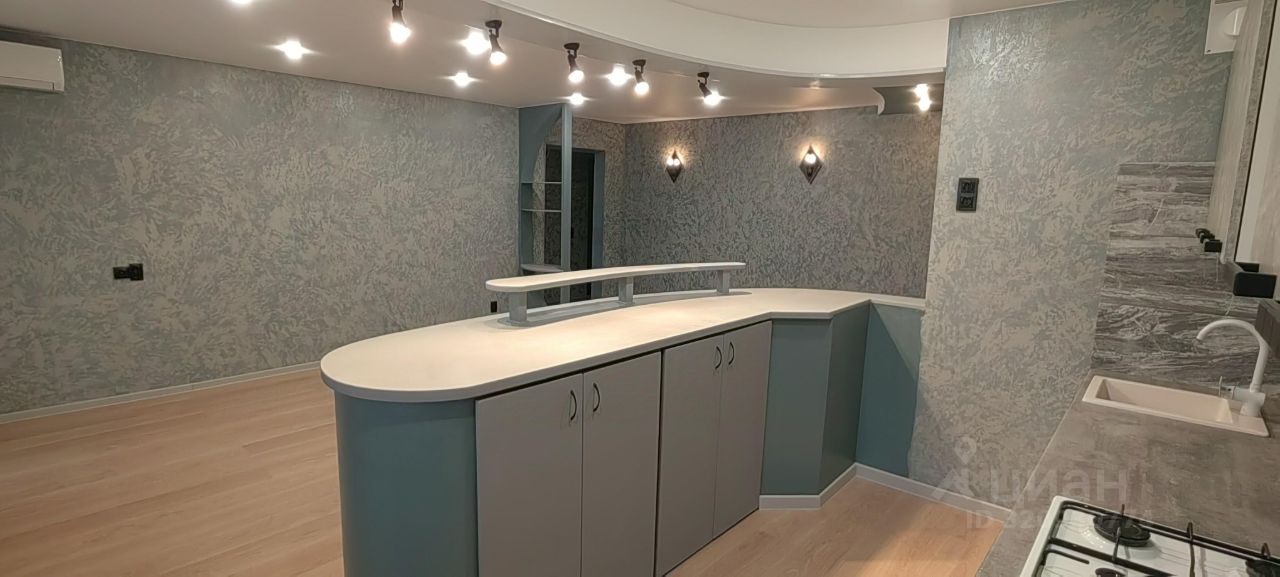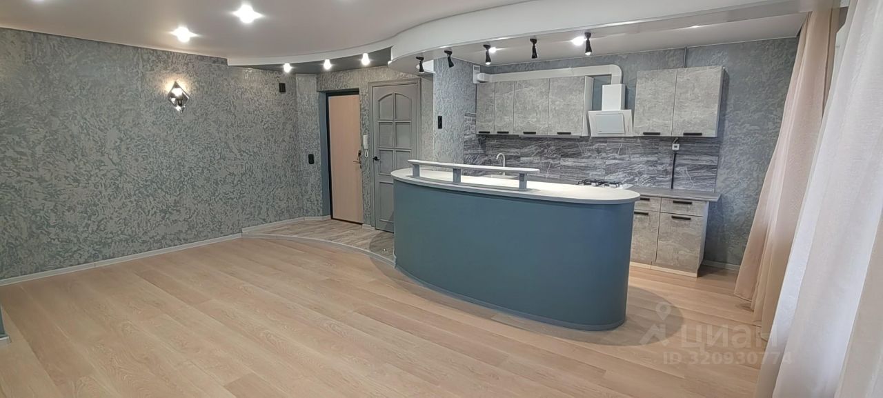 большой остров-барная стойка с местом для хранения под ней. Столешница в стиле бетон.