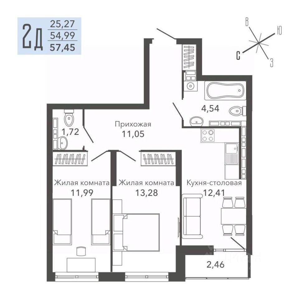 Общая площадь57,45 м2