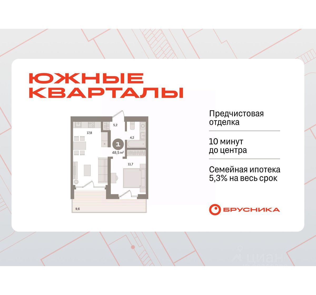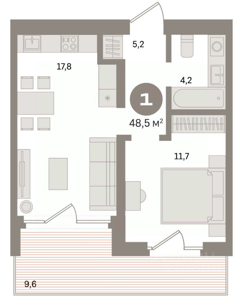 Квартира с кухней-гостиной и одной спальней в Южных кварталах. Особенности планировки: предчистовая отделка, балкон. квартиры в нашей базе: ЮК04-А1-9-9.9.10.