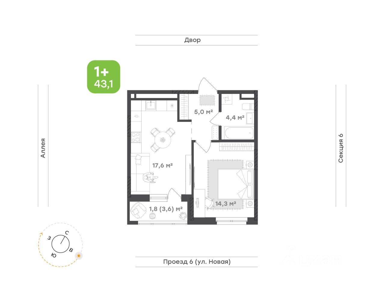 Идеальный вариант для самостоятельной жизни Концепция ''тихий дом'': все квартиры в доме с чистовой отделкой, никаких шумных ремонтных работ с утра до вечера Кухня-гостиная 17,6 м² с выходом на лоджию — сердце квартиры, наполненное светом и уютом. Здесь удобно готовить, принимать гостей или отдыхать после долгого дня С лоджии 3,6 м² открывается прекрасный вид на город Спальня 14,3 м² — место для отдыха и восстановления. Пространство продумано так, чтобы здесь было комфортно и уютно, а выделенная зона под шкаф поможет организовать хранение без перегруженности интерьера Санузел 4,4 м² — стильный и функциональный. Достаточно места для всей необходимой сантехники, а грамотная планировка делает пространство удобным Прихожая 5,0 м² встречает продуманным местом для хранения. Всё под рукой, но ничего лишнего — здесь легко поддерживать порядок и уют