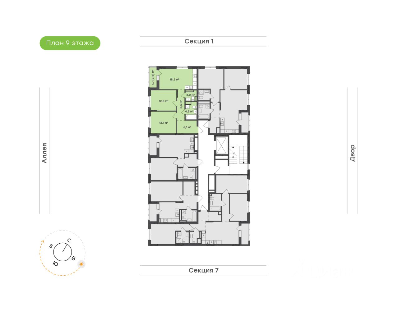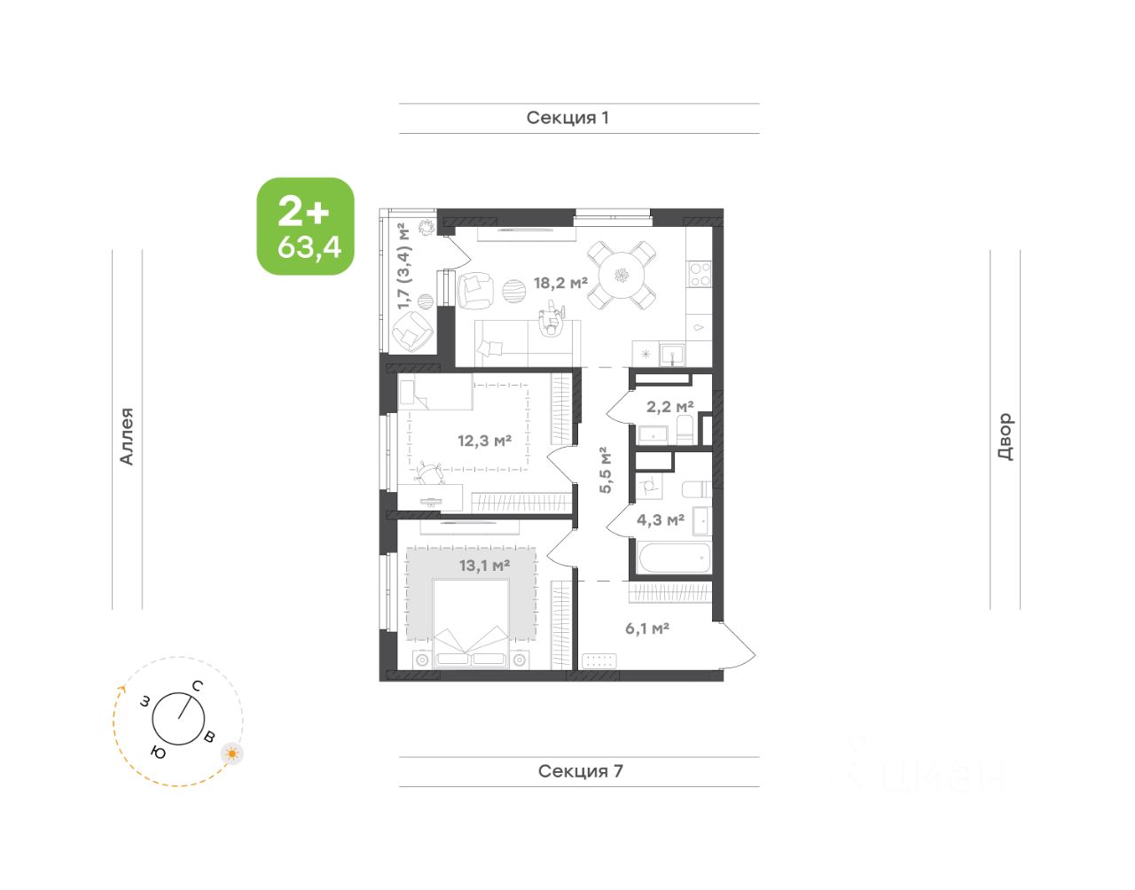 Кухня-гостиная 18,2 м² объединяет в себе стиль и практичность, а выход на лоджию 3,4 м² с видом на аллею дарит ощущение спокойствия и свежести