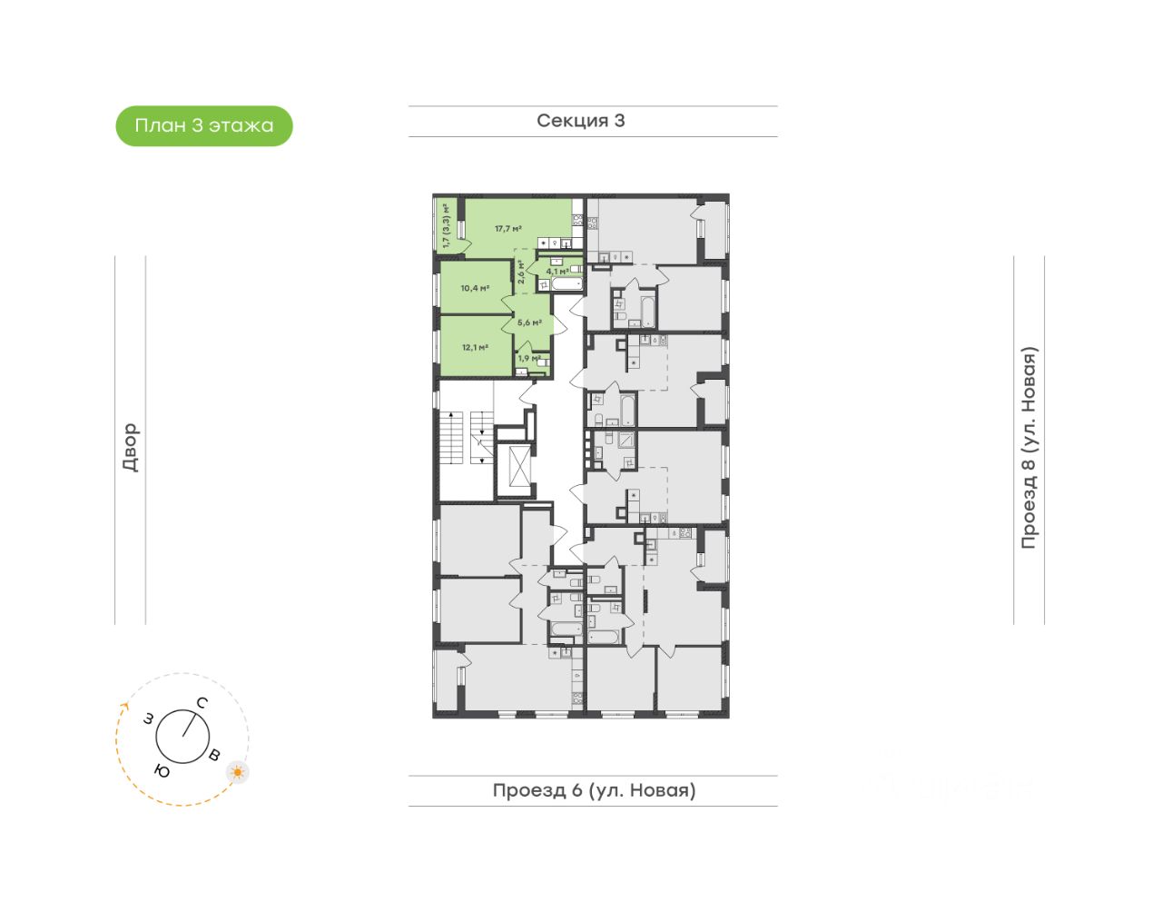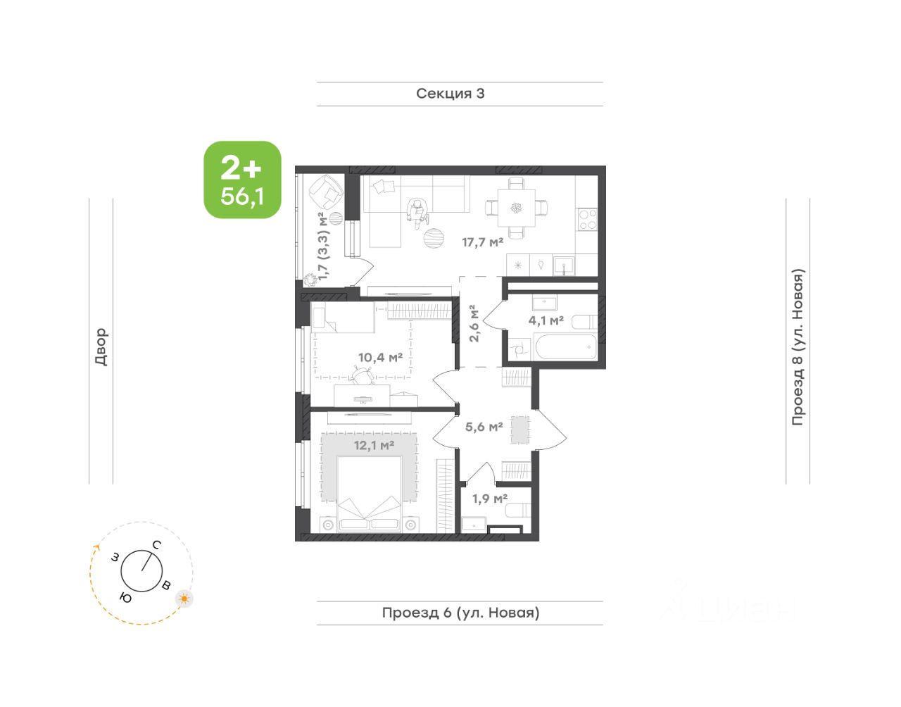 Квартира для тех, кто хочет окунуться в мир современного уюта и функциональности Кухня-гостиная 17,7 м² объединяет в себе стиль и практичность, а выход на лоджию 3,3 м² с видом на двор дарит ощущение спокойствия и свежести Родительская спальня 12,1 м² становится личным укромным уголком, где предусмотрено место под шкаф для идеальной организации пространства Детская 10,4 м² — светлая и радостная, с продуманным местом под шкаф, где каждая деталь способствует комфортному росту и развитию Просторная прихожая 5,6 м² с двумя шкафами-купе позволяет хранить вещи аккуратно и организованно Коридор 2,6 м² создаёт плавное и логичное соединение между всеми зонами квартиры Два санузла — один 4,1 м² с ванной и местом под стиральную машину, и второй 1,9 м², компактный, но максимально функциональный, для комфорта всей семьи