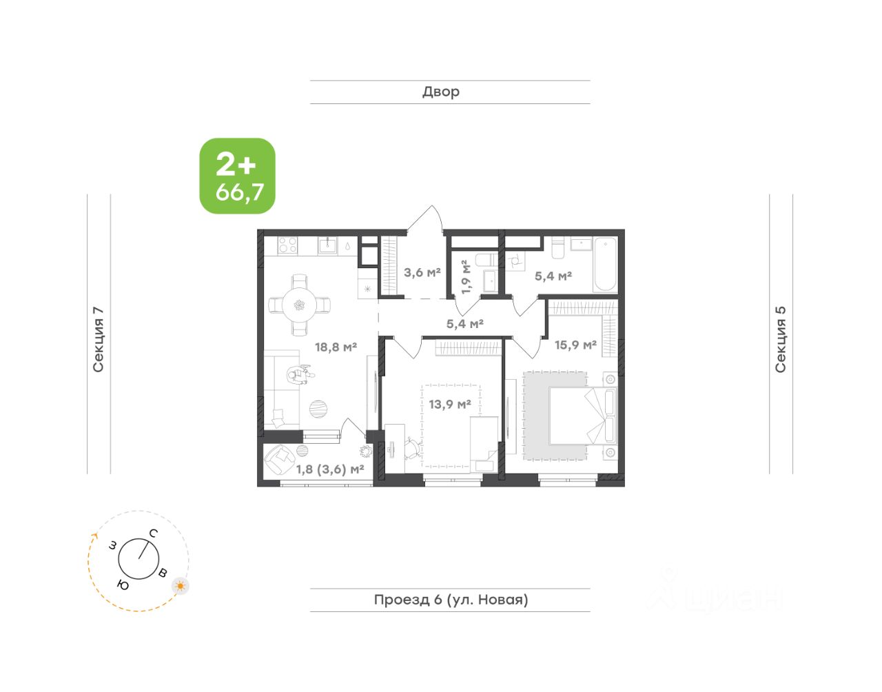 Уютная квартира, где каждая деталь продумана для комфортной жизни Концепция ''тихий дом'': все квартиры в доме с чистовой отделкой, никаких шумных ремонтных работ с утра до вечера Кухня-гостиная 18,8 м² с выходом на панорамную лоджию 3,6 м²— место, где встречается вся семья. Уютное пространство для тёплых ужинов, душевных разговоров и весёлых встреч с друзьями Просторный санузел 5,4 м² с ванной — место для расслабления, а дополнительный санузел 1,9 м² гарантирует удобство для всей семьи Родительская спальня 15,9 м² станет личным уголком спокойствия. Здесь можно уединиться и расслабиться после насыщенного дня Детская комната 13,9 м² — светлая, уютная и функциональная. Достаточно места для игр, учёбы и отдыха, чтобы ребенок чувствовал себя комфортно Прихожая 3,6 м² с выделенным местом под систему хранения поможет поддерживать порядок и избавит от необходимости искать место для верхней одежды и обуви Коридор 5,4 м² отвечает за удобную навигацию по квартире, связывая все зоны в единое, гармоничное целое