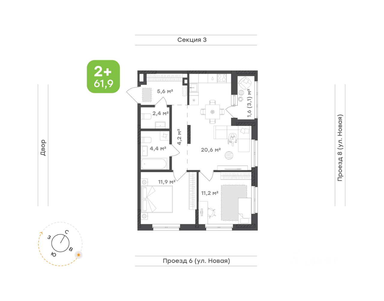Два санузла один 4,4 м² с ванной и местом под стиральную машину для расслабляющих процедур, и второй 2,4 м², компактный и практичный, для повседневного использования
