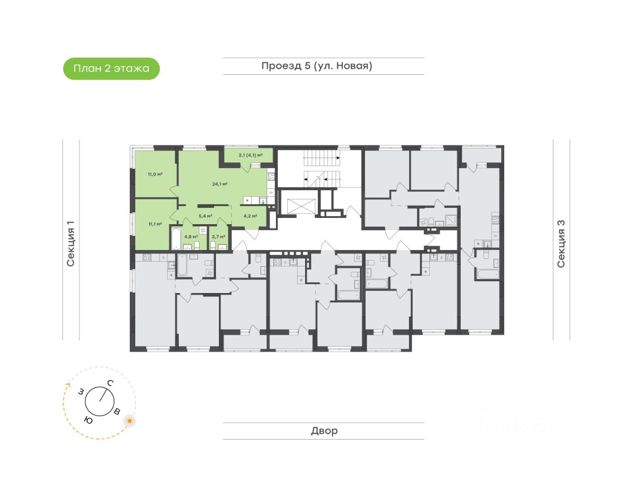 Квартира для тех, кто любит свет и простор Кухня-гостиная 24,1 м² — просторная и наполненная светом. Здесь легко зонировать пространство: выделить комфортную кухню, обеденную зону и место для отдыха. А выход на лоджию 4,1 м² открывает живописный вид на город, позволяя наслаждаться им в любое время дня Родительская спальня 11,0 м² — уединённое пространство с большим угловым окном. Светлая, просторная и продуманная до мелочей. Предусмотрено место под шкаф, чтобы хранение вещей было удобным, а интерьер оставался лёгким и гармоничным Детская 11,1 м² — уютная и функциональная. В ней комфортно и играть, и заниматься, а благодаря правильной форме комнаты можно легко организовать удобное пространство Два санузла делают жизнь в квартире ещё комфортнее. Основной 4,8 м² с ванной — место для расслабления, а дополнительный 2,7 м² позволяет избежать утренних очередей Прихожая 4,2 м² и коридор 5,4 м² создают удобную навигацию по квартире. Достаточно места для систем хранения, чтобы вещи всегда были под рукой