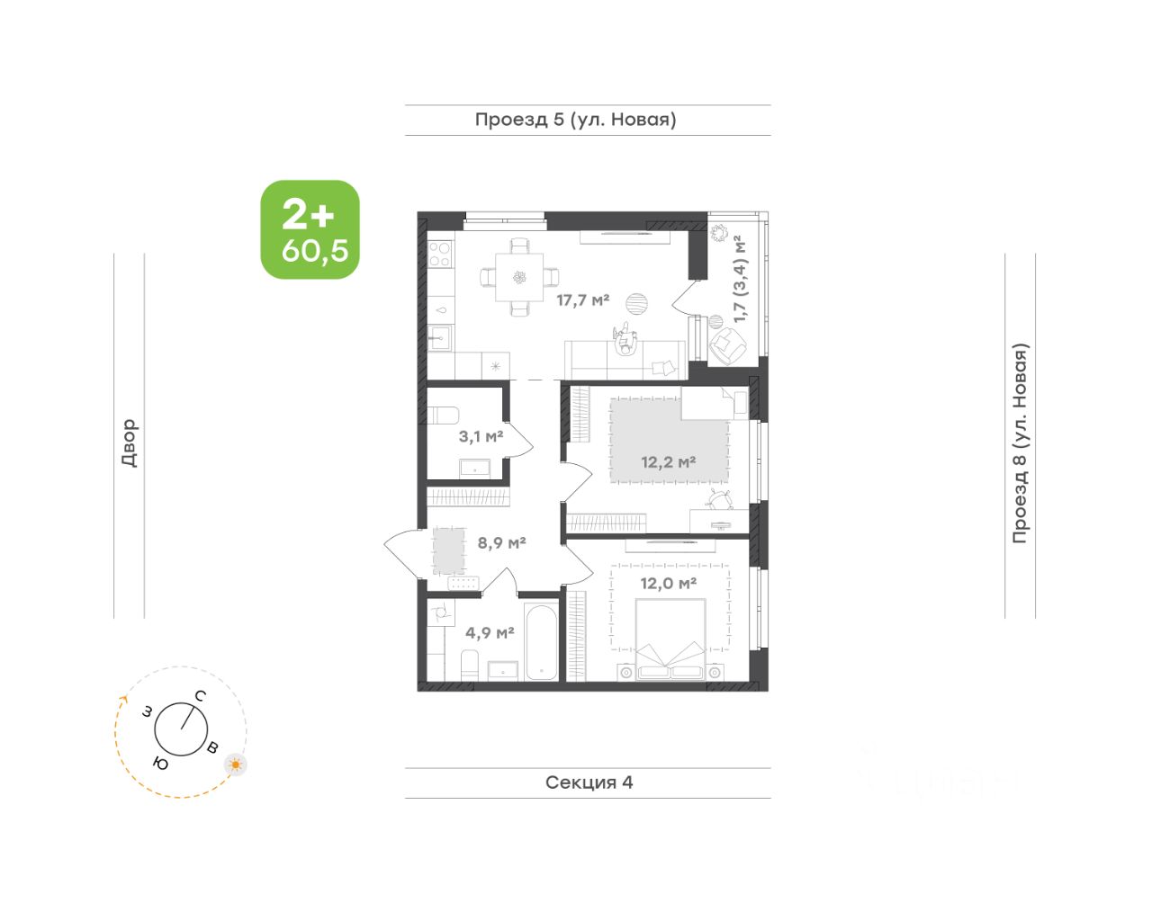 Классика в современной интерпретации Кухня-гостиная 17,7 м² — место для общения, отдыха и вечеров в кругу семьи. Важным акцентом является выход на лоджию 3,4 м² с угловым остеклением, открывающую прекрасный вид на город Родительская спальня 12,0 м² дарит ощущение уединения и комфорта. Место под шкаф оптимально решает вопросы хранения, а само пространство остаётся свободным и просторным, идеально подходящим для отдыха Детская 12,2 м² с продуманной системой хранения позволит организовать функциональное пространство для игр, учёбы и сна. Здесь не будет лишних вещей, а каждый предмет найдёт своё место Два санузла позволяют легко справляться с утренними и вечерними заботами. Первый 4,9 м² с ванной и местом под стиральную машину — это удобно и практично. Второй 3,1 м² — ещё один важный элемент для вашего комфорта Просторная прихожая 8,9 м² дарит ощущение лёгкости и организованности. Здесь нет лишних элементов, а продуманные зоны для хранения вещей позволяют поддерживать порядок без усилий Окна на две стороны.