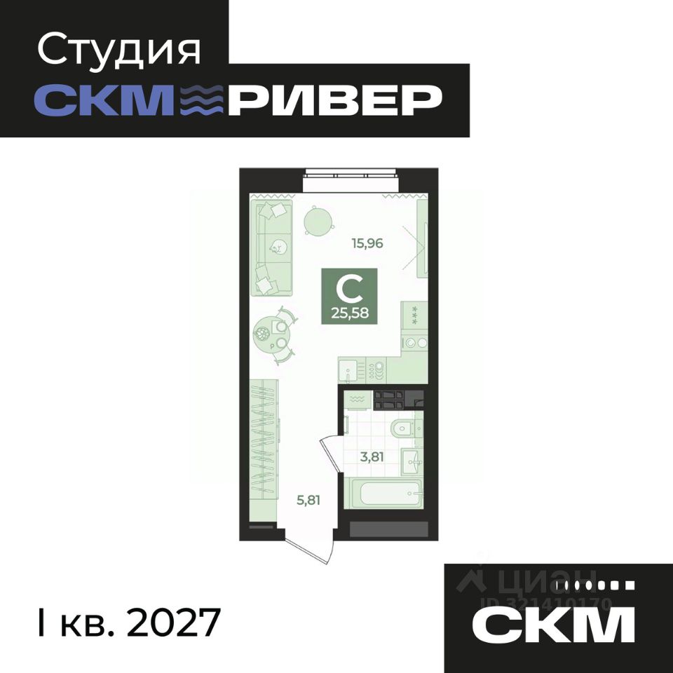 Продаётся студия в строящемся доме (1 очередь), срок сдачи: I-кв. 2027, общей площадью 25.58 кв.м., на 5 этаже. Новый жилой комплекс ''СКМ Ривер'' от застройщика ''СКМ Двелопмент'' расположен по адресу: г. Екатеринбург, улица Щербакова.