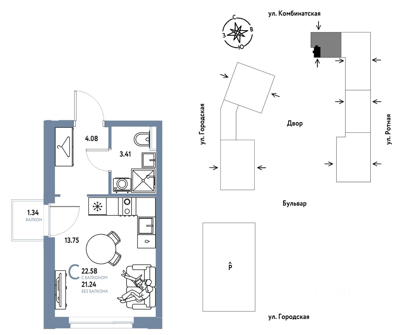 Продаётся студия в строящемся доме (Дом 1), срок сдачи: II-кв. 2027, общей площадью 22.58 кв.м., на 3 этаже. Новый жилой комплекс ''Уральский сад'' от застройщика ''ГК Страна Девелопмент'' расположен по адресу: г. Екатеринбург, посёлок Совхозный, Комбинатская улица.