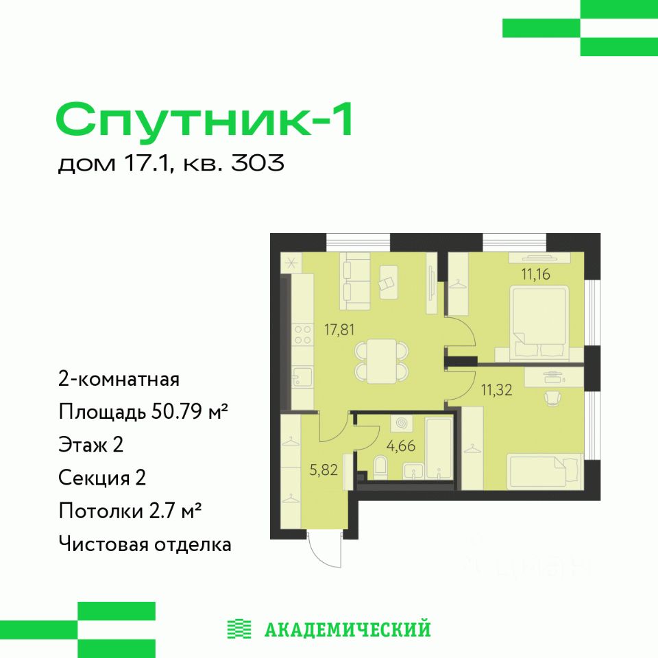 Продается 2-комнатная квартира площадью 50.79 кв.м. от девелопера ''Академический'' в жилом квартале ''Спутник 1''. Срок сдачи дома в 2027 году.