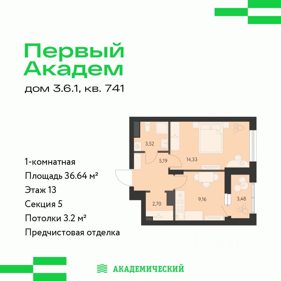 Продается 1-комнатная квартира площадью 36.64 кв.м. от девелопера ''Академический'' в жилом квартале ''Первый Академ''. Срок сдачи дома в 2026 году. Выгоды и скидка напрямую от застройщика.