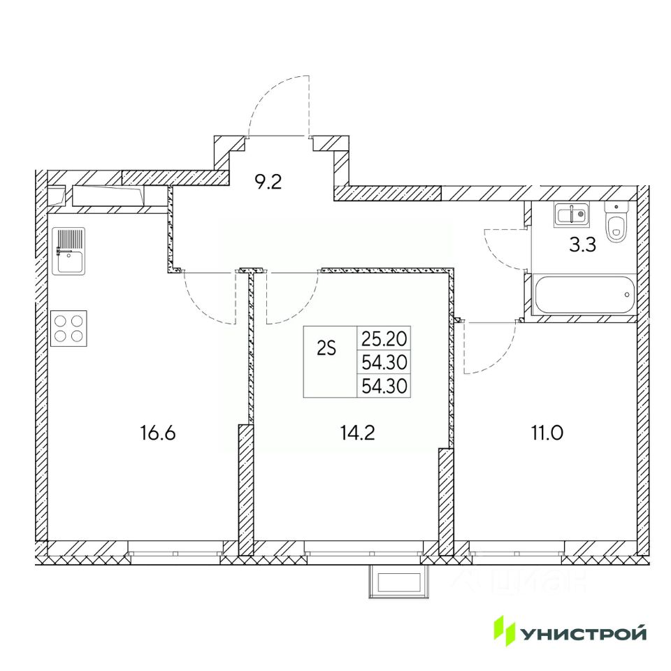 Общая площадь54,3 м2