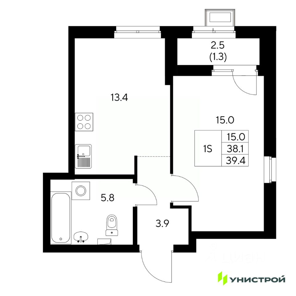 Общая площадь39,4 м2