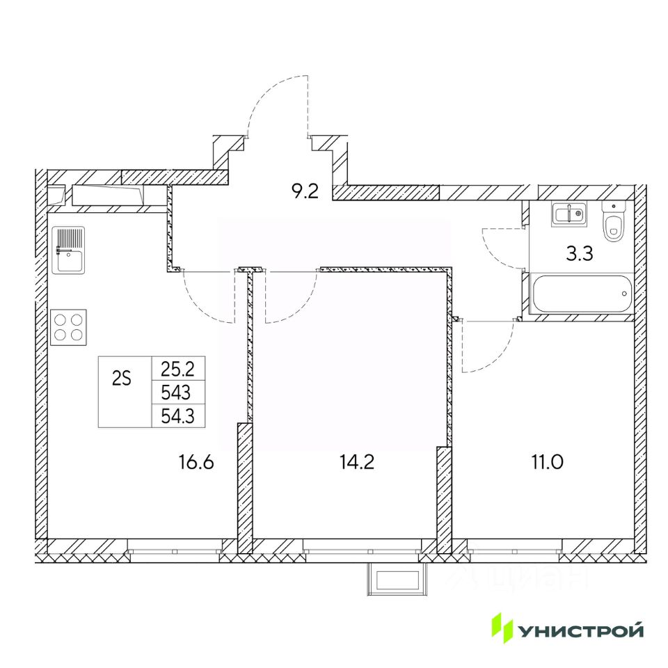 Общая площадь54,3 м2