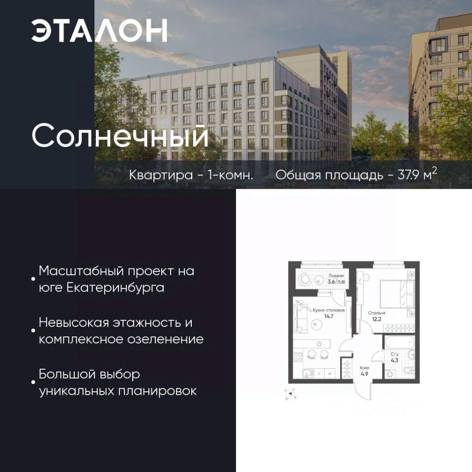Продается квартира 440, по адресу Свердловская обл., г. Екатеринбург, Чкаловский район, корпус Солнечный, блок 6.3 в Солнечный на 6 этаже, с площадью 37.9 м2.