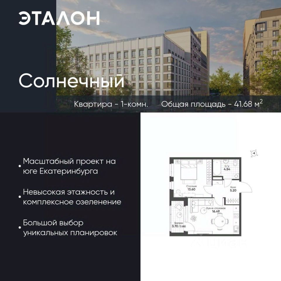 Продается квартира 39, по адресу Свердловская обл., г. Екатеринбург, Чкаловский район, корпус Солнечный, корпус 6.2 в Солнечный на 5 этаже, с площадью 41.68 м2.