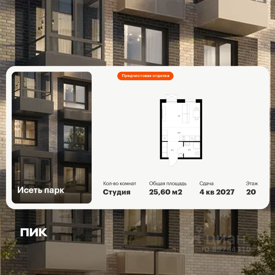 Продаётся квартира-студия площадью 25,6 кв.м на 20 этаже 24 этажного дома (Корпус 5, Секция 1) проекта ПИК Исеть парк. Светлый просторный подъезд на уровне земли, функциональная планировка, большие окна, предчистовая отделка.