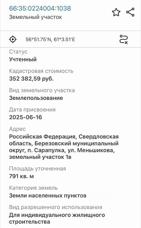 Продается участок в поселке Сарапулка, расстояние от Березовского 19 км.