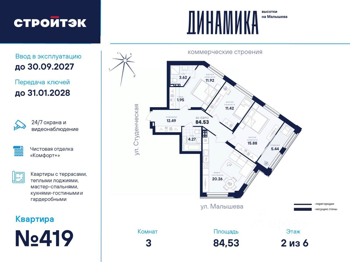 Настройте жизнь на максимум В Динамике воплощают мечты. Её фасады стремятся ввысь и рисуют силуэт ступеней — символа вашего движения, где всё задуманное сбывается. В интеллигентном микрорайоне Втузгородок всё под рукой. Пешком до остановки 5 минут, на машине до центра — 10. Соседство с торговыми комплексами и доступность ЕКАД входят в число преимуществ квартала наравне с близостью УРФУ, главных театров, филармонии, школ и детсадов. Выгляните в окно — и увидите знаменитое озеро Шарташ, которому около миллиона лет. Здесь катаются на сапах, лодках и катамаранах, а в Шарташском лесопарке вокруг озера — на велосипедах летом и лыжах зимой. Новое звучание района Выразительные башни Динамики притягивают взгляды издалека. Сплошные стеклянные витражи фасадов меняют восприятие проекта в зависимости от ракурса, времени года и суток. В квартирах с витражным остеклением алюминиевые оконные рамы и широкие подоконники визуально увеличивают пространство. Благодаря современным технологиям витражи обеспечивают дополнительную теплоизоляцию, помогая сохранять комфортный микроклимат в квартире и летом, и зимой. Отдых в вашем ритме Выбирайте досуг по душе для себя и семьи. Занимайтесь на тренажёрах и воркаут-комплексе, играйте в пинг-понг, футбол или баскетбол. А детей предоставьте насыщенному плейхабу, который тренирует тактильность и равновесие в атмосфере безопасности и контролируемого риска. Размеренно прогуливайтесь меж декоративных холмов, под тенистыми навесами-перголами вблизи удобных скамеек, многолетних трав и разновысотной уличной мебели. СТРОЙТЭК возводит Динамику в 3 этапа. Второй этап строительства В нём 2 секции. С2 — престижная высотка в 31 этаж. Здесь 209 квартир от 1- до 3-комнатных и 19 уникальных планировок с просторными кухнями-гостиными до 21 м квадратного. Кроме того, закрытый паркинг на 31 место и 40 кладовых-келлеров внутри стилобата. В подъезде С2 — светлый холл с минималистичным дизайном бизнес-класса, помещения для колясок и самокатов, а также 3 надёжных лифта на 1 000 кг каждый. С4 — парадный 6-этажный дом с элегантной смещённой геометрией и полным витражным остеклением всех 5 жилых этажей. Внизу расположено впечатляющее лобби с лаунж-зоной и стойкой ресепшен, атмосферная уличная площадь для встреч и торговая галерея. В секции всего 34 квартиры в 16 уникальных планировках от студий до 3-комнатных. Это особый уровень респектабельной и неторопливой жизни. Технологии комфорта Обратите внимание на специальные форматы планировок с гардеробными и тёплыми лоджиями. Отдельно в С4 — на видовые квартиры с террасами на 5 и 6 этажах, а также лоты с мастер-спальнями, где у приватного пространства для отдыха своя ванная. Что касается отделки — в Динамике улучшенный стандарт ''Комфорт+''. Помимо привычных комфортных сантехники и электрики, в него входят оконные стёкла Energy Light, приточные клапаны вентиляции Air-Box, особо прочный ламинат 33 класса и устойчивые к многократной покраске виниловые обои. Белые межкомнатные двери и плинтусы лаконично подчеркну