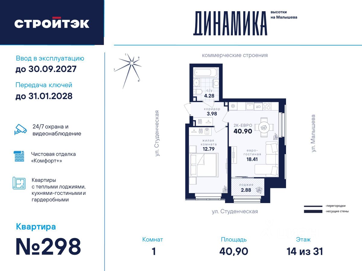 Настройте жизнь на максимум В Динамике воплощают мечты. Её фасады стремятся ввысь и рисуют силуэт ступеней — символа вашего движения, где всё задуманное сбывается. В интеллигентном микрорайоне Втузгородок всё под рукой. Пешком до остановки 5 минут, на машине до центра — 10. Соседство с торговыми комплексами и доступность ЕКАД входят в число преимуществ квартала наравне с близостью УРФУ, главных театров, филармонии, школ и детсадов. Выгляните в окно — и увидите знаменитое озеро Шарташ, которому около миллиона лет. Здесь катаются на сапах, лодках и катамаранах, а в Шарташском лесопарке вокруг озера — на велосипедах летом и лыжах зимой. Новое звучание района Выразительные башни Динамики притягивают взгляды издалека. Сплошные стеклянные витражи фасадов меняют восприятие проекта в зависимости от ракурса, времени года и суток. В квартирах с витражным остеклением алюминиевые оконные рамы и широкие подоконники визуально увеличивают пространство. Благодаря современным технологиям витражи обеспечивают дополнительную теплоизоляцию, помогая сохранять комфортный микроклимат в квартире и летом, и зимой. Отдых в вашем ритме Выбирайте досуг по душе для себя и семьи. Занимайтесь на тренажёрах и воркаут-комплексе, играйте в пинг-понг, футбол или баскетбол. А детей предоставьте насыщенному плейхабу, который тренирует тактильность и равновесие в атмосфере безопасности и контролируемого риска. Размеренно прогуливайтесь меж декоративных холмов, под тенистыми навесами-перголами вблизи удобных скамеек, многолетних трав и разновысотной уличной мебели. СТРОЙТЭК возводит Динамику в 3 этапа. Второй этап строительства В нём 2 секции. С2 — престижная высотка в 31 этаж. Здесь 209 квартир от 1- до 3-комнатных и 19 уникальных планировок с просторными кухнями-гостиными до 21 м квадратного. Кроме того, закрытый паркинг на 31 место и 40 кладовых-келлеров внутри стилобата. В подъезде С2 — светлый холл с минималистичным дизайном бизнес-класса, помещения для колясок и самокатов, а также 3 надёжных лифта на 1 000 кг каждый. С4 — парадный 6-этажный дом с элегантной смещённой геометрией и полным витражным остеклением всех 5 жилых этажей. Внизу расположено впечатляющее лобби с лаунж-зоной и стойкой ресепшен, атмосферная уличная площадь для встреч и торговая галерея. В секции всего 34 квартиры в 16 уникальных планировках от студий до 3-комнатных. Это особый уровень респектабельной и неторопливой жизни. Технологии комфорта Обратите внимание на специальные форматы планировок с гардеробными и тёплыми лоджиями. Отдельно в С4 — на видовые квартиры с террасами на 5 и 6 этажах, а также лоты с мастер-спальнями, где у приватного пространства для отдыха своя ванная. Что касается отделки — в Динамике улучшенный стандарт ''Комфорт+''. Помимо привычных комфортных сантехники и электрики, в него входят оконные стёкла Energy Light, приточные клапаны вентиляции Air-Box, особо прочный ламинат 33 класса и устойчивые к многократной покраске виниловые обои. Белые межкомнатные двери и плинтусы лаконично подчеркну