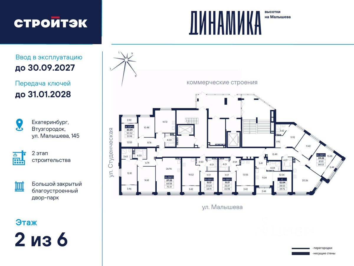 Настройте жизнь на максимум В Динамике воплощают мечты. Её фасады стремятся ввысь и рисуют силуэт ступеней — символа вашего движения, где всё задуманное сбывается. В интеллигентном микрорайоне Втузгородок всё под рукой. Пешком до остановки 5 минут, на машине до центра — 10. Соседство с торговыми комплексами и доступность ЕКАД входят в число преимуществ квартала наравне с близостью УРФУ, главных театров, филармонии, школ и детсадов. Выгляните в окно — и увидите знаменитое озеро Шарташ, которому около миллиона лет. Здесь катаются на сапах, лодках и катамаранах, а в Шарташском лесопарке вокруг озера — на велосипедах летом и лыжах зимой. Новое звучание района Выразительные башни Динамики притягивают взгляды издалека. Сплошные стеклянные витражи фасадов меняют восприятие проекта в зависимости от ракурса, времени года и суток. В квартирах с витражным остеклением алюминиевые оконные рамы и широкие подоконники визуально увеличивают пространство. Благодаря современным технологиям витражи обеспечивают дополнительную теплоизоляцию, помогая сохранять комфортный микроклимат в квартире и летом, и зимой. Отдых в вашем ритме Выбирайте досуг по душе для себя и семьи. Занимайтесь на тренажёрах и воркаут-комплексе, играйте в пинг-понг, футбол или баскетбол. А детей предоставьте насыщенному плейхабу, который тренирует тактильность и равновесие в атмосфере безопасности и контролируемого риска. Размеренно прогуливайтесь меж декоративных холмов, под тенистыми навесами-перголами вблизи удобных скамеек, многолетних трав и разновысотной уличной мебели. СТРОЙТЭК возводит Динамику в 3 этапа. Второй этап строительства В нём 2 секции. С2 — престижная высотка в 31 этаж. Здесь 209 квартир от 1- до 3-комнатных и 19 уникальных планировок с просторными кухнями-гостиными до 21 м квадратного. Кроме того, закрытый паркинг на 31 место и 40 кладовых-келлеров внутри стилобата. В подъезде С2 — светлый холл с минималистичным дизайном бизнес-класса, помещения для колясок и самокатов, а также 3 надёжных лифта на 1 000 кг каждый. С4 — парадный 6-этажный дом с элегантной смещённой геометрией и полным витражным остеклением всех 5 жилых этажей. Внизу расположено впечатляющее лобби с лаунж-зоной и стойкой ресепшен, атмосферная уличная площадь для встреч и торговая галерея. В секции всего 34 квартиры в 16 уникальных планировках от студий до 3-комнатных. Это особый уровень респектабельной и неторопливой жизни. Технологии комфорта Обратите внимание на специальные форматы планировок с гардеробными и тёплыми лоджиями. Отдельно в С4 — на видовые квартиры с террасами на 5 и 6 этажах, а также лоты с мастер-спальнями, где у приватного пространства для отдыха своя ванная. Что касается отделки — в Динамике улучшенный стандарт ''Комфорт+''. Помимо привычных комфортных сантехники и электрики, в него входят оконные стёкла Energy Light, приточные клапаны вентиляции Air-Box, особо прочный ламинат 33 класса и устойчивые к многократной покраске виниловые обои. Белые межкомнатные двери и плинтусы лаконично подчеркну